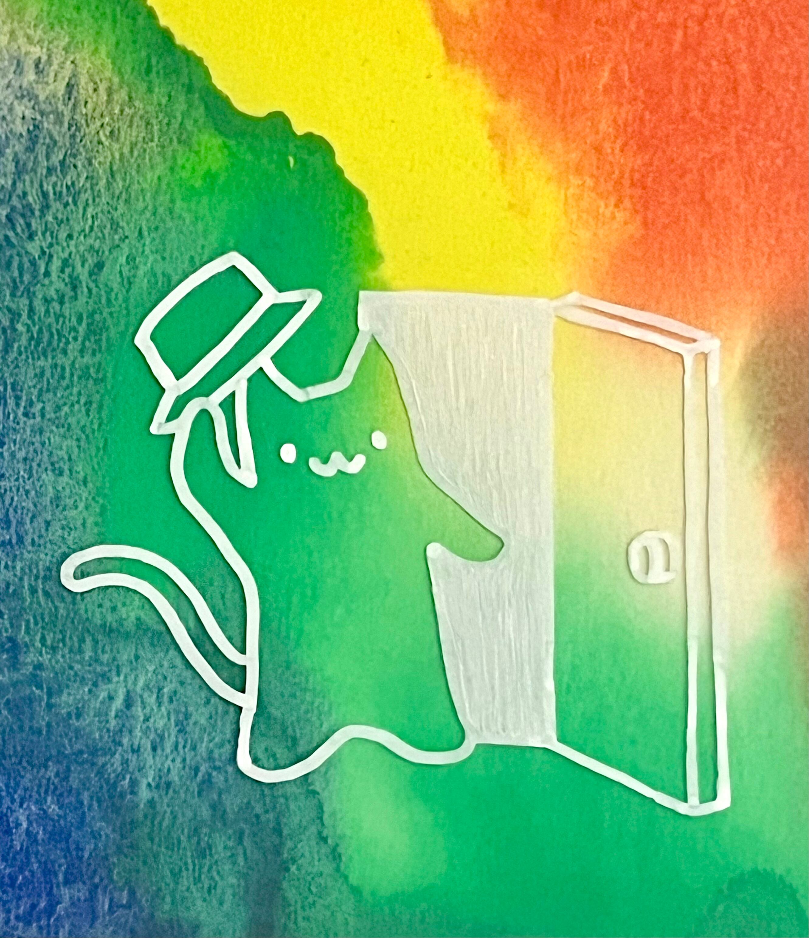 光の世界から扉を開けてこちらに挨拶をする旅するねこの「たびねこ」を描きました。